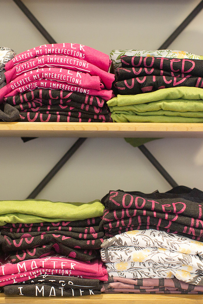 Wearing Jasmine Road T-Shirts is a wonderful way to share the mission and the message that we are a part of a community that is “Rooted in Love” and to express our kinship with one another. Jasmine Road offers several different designs that come in many colors, shapes and sizes for sale at Jasmine Kitchen and all profits support operations of Jasmine Road.